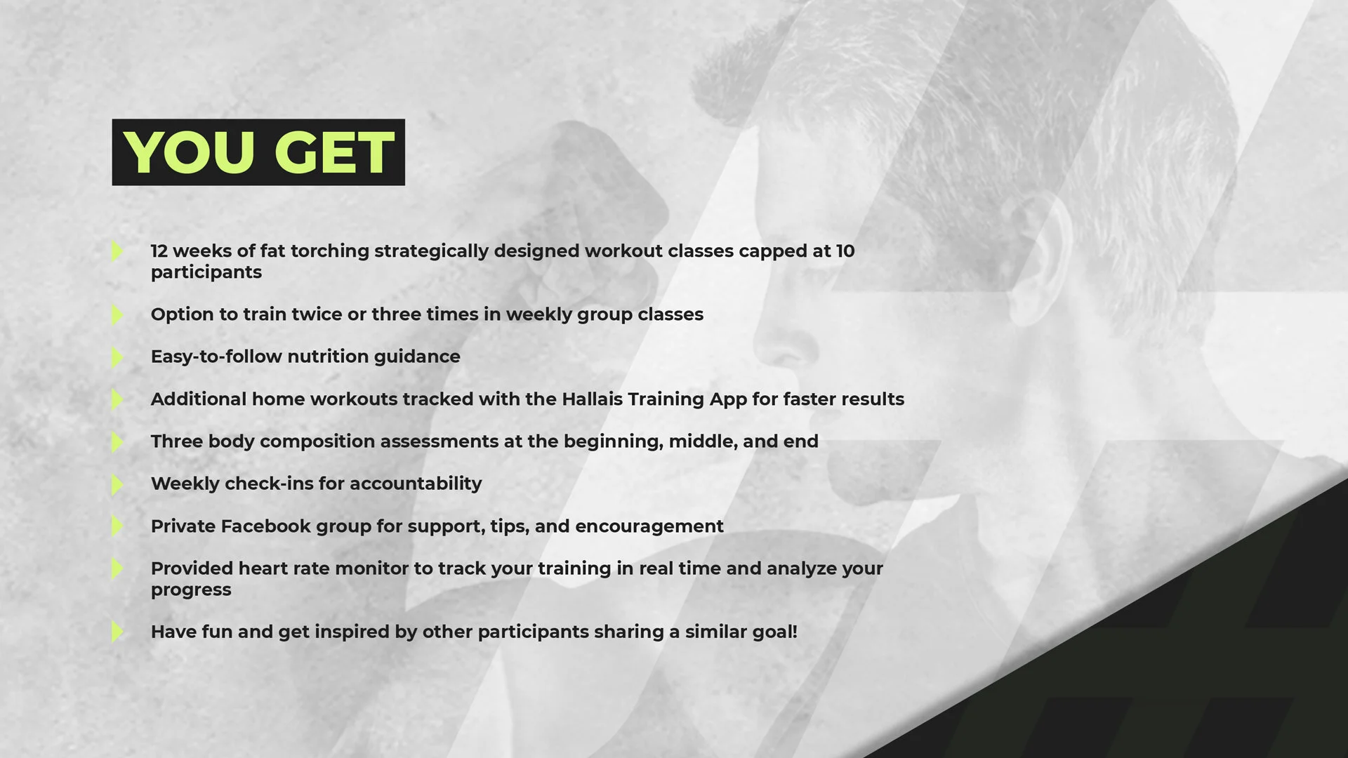 Receive access to the Hallais Training App to find complementary home and gym workouts.